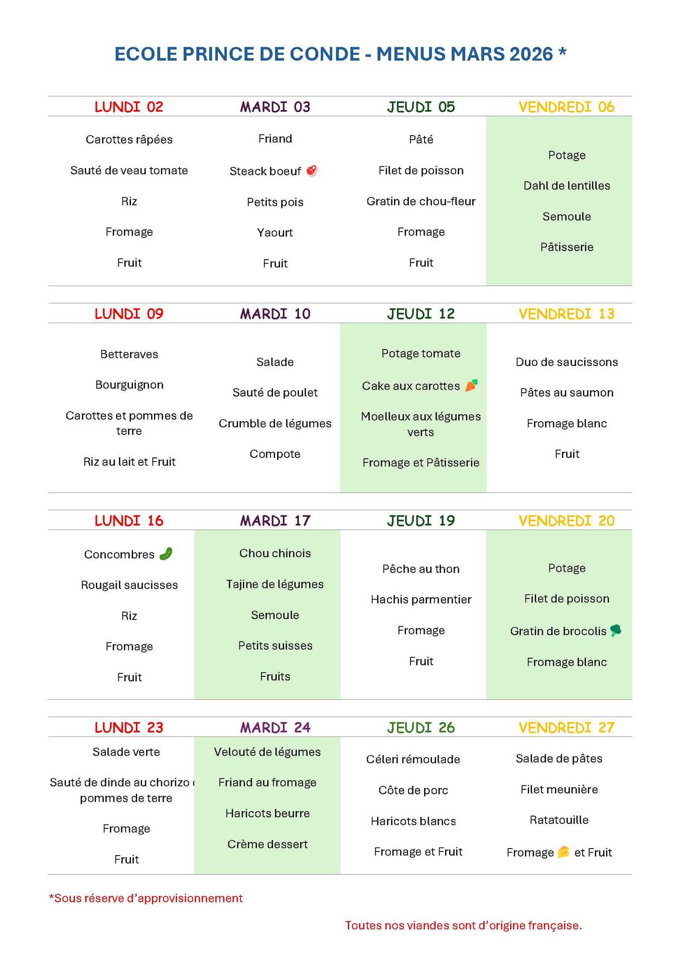 Menus scolaires